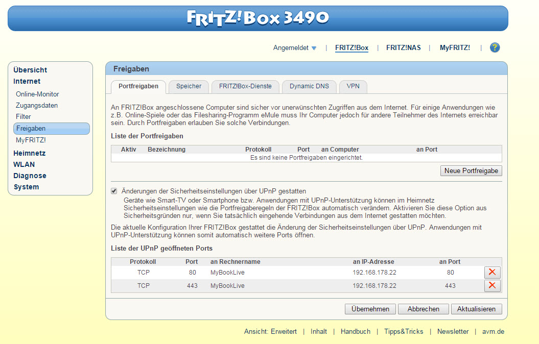 Der Bereich „Freigaben“ beinhaltet die Port-Einstellungen. Hier könnt ihr selber Ports freigeben oder einstellen, ob Netzwerkgeräte selbstständig Ports freigeben dürfen.