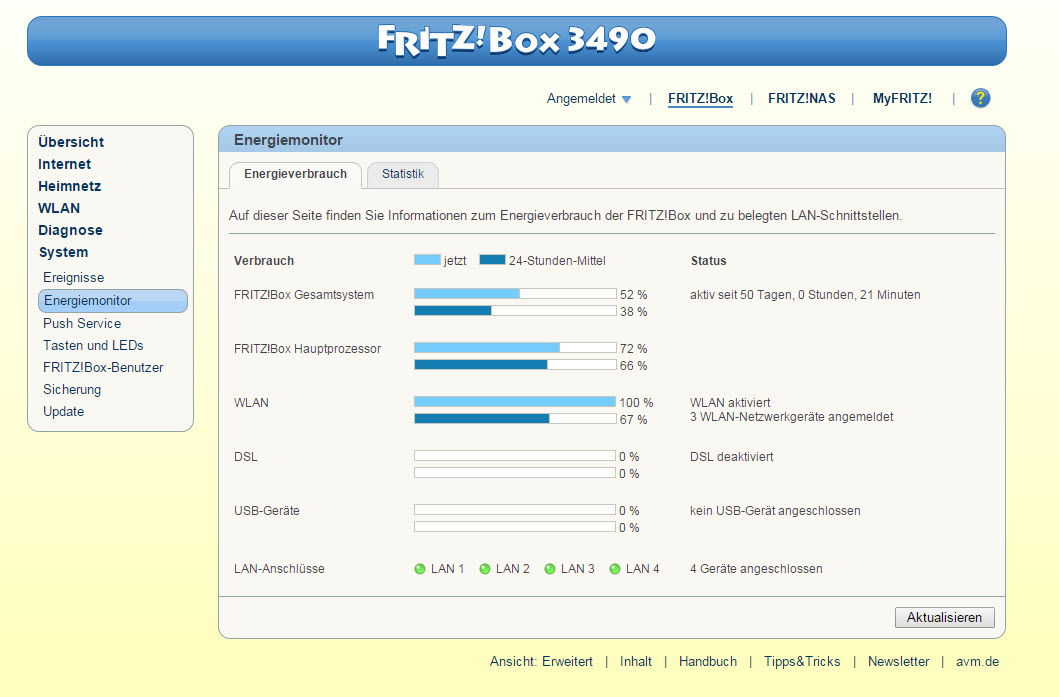 Allgemeine Einstellungen findet man im Punkt „System“. Hier könnt ihr euch über den Energiemonitor die Auslastung eurer Box anzeigen lassen. Über den Punkt „Tasten und LEDs“ könnt ihr die auf der Oberseite der Box befindlichen Taster sperren, um ein versehentliches Ausschalten der Box bzw. des WLAN-Signals zu verhindern. Ebenso könnt ihr das Verhalten der LEDs konfigurieren. Wie oben bereits genannt, ist eine komplette Abschaltung der LEDs nicht möglich.