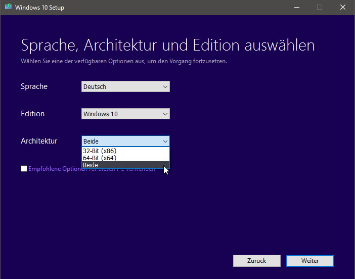 Beim MediaCreationTool für die 10586 wurden ja nun beide Versionen (Home und Pro) in eine ISO integriert. Aber auch hier kann man unter Architektur „Beide“ auswählen, wenn man den Haken für die „Empfohlene Optionen für diesen PC verwenden“ entfernt hat.