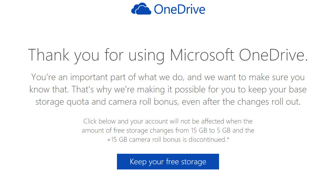 Wer nicht auf die 5 GB zurückgestuft werden will, muss auf dieser Seite: preview.onedrive.com/bonus/ bis zum 31.Januar 2016 bestätigen, dass er oder sie den Speicherplatz weiterhin behalten wollen.