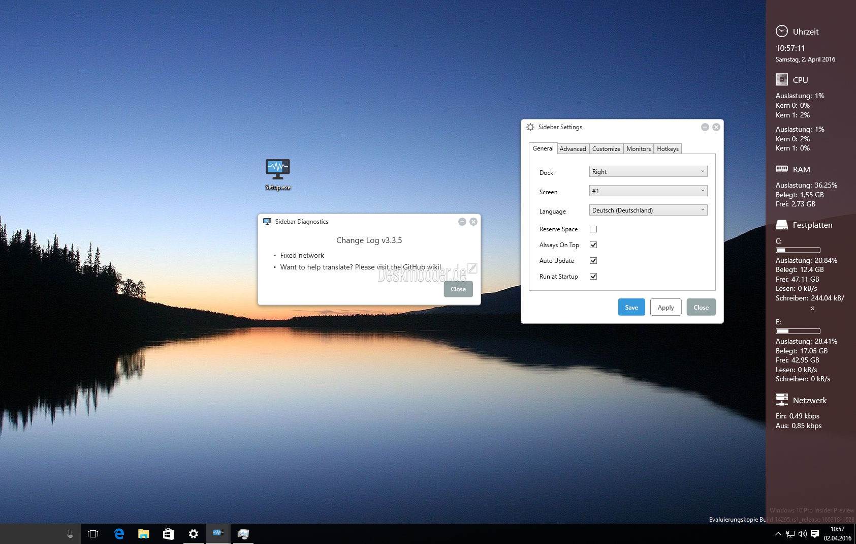 Wer einen Überblick über die Temperaturen, Auslastung, Belegung seiner CPU, RAM, Festplatten, Netzwerk und Grafikkarte auf dem Desktop angezeigt bekommen möchte, kann zu den guten alten Gadgets greifen, oder ganz einfach Sidebar Diagnostics nutzen. Ich hab es einmal in der Windows 10 14295 getestet.