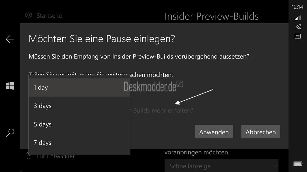 Hier hat man nun die Auswahl zwischen Pausieren (1 – 7 Tage) oder darunter den Satz: „Möchten Sie überhaupt keine Insider Builds mehr erhalten?“