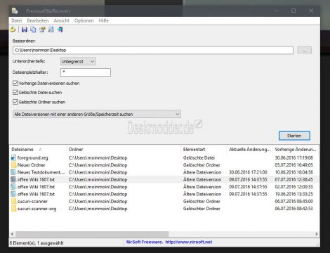 Man wählt einen Ordner aus, in dem die Datei oder Ordner gelegen hat. Kann die Unterordnertiefe einstellen oder gezielt nach Dateinamen suchen lassen. Ein Klick auf Starten und PreviousFilesRecovery durchsucht alle Schattenkopien, die existieren.