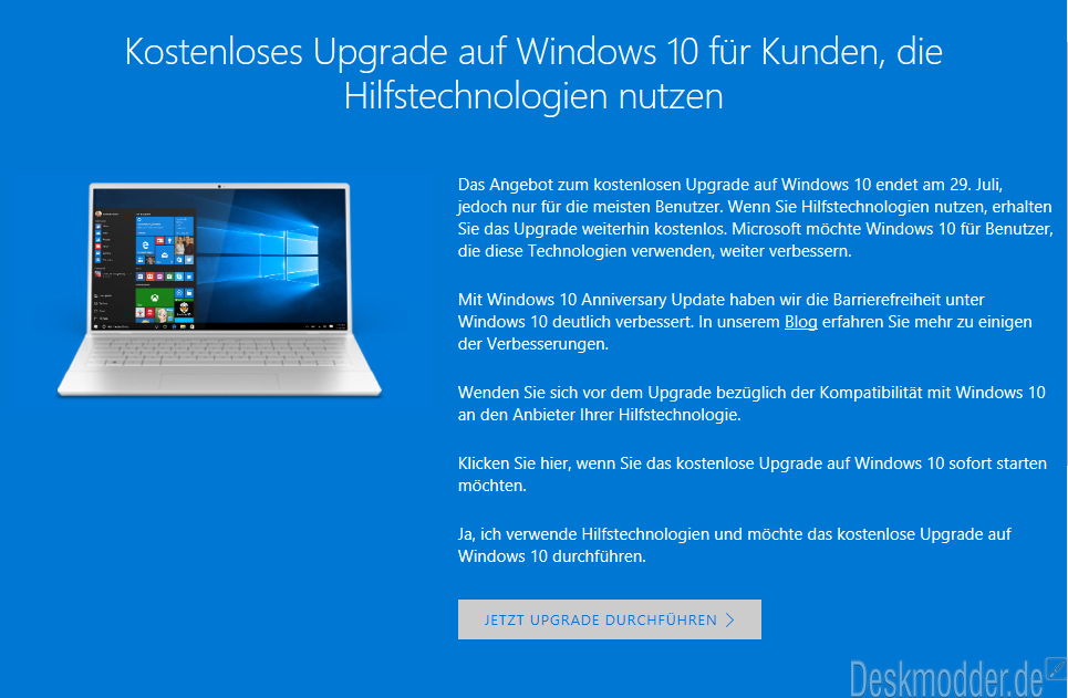 Eingerichtet ist diese Seite für „Kunden, die Hilfstechnologien nutzen“. Microsoft selber hatte ja schon im Vorfeld angekündigt, dass diese Nutzer, die auf Hilfstechnologien angewiesen sind, weiterhin kostenlos upgraden können.