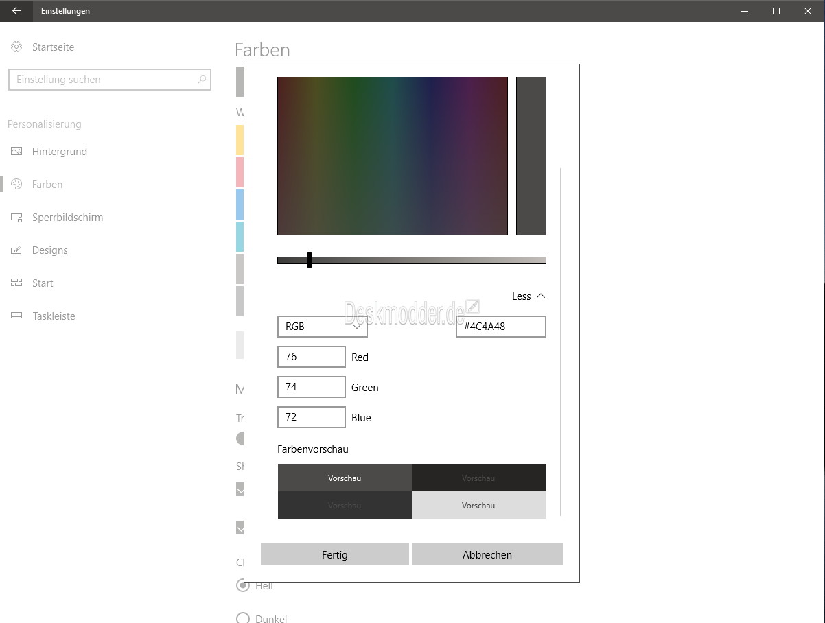 Ersteinmal zu guter Letzt die Farbanpassungen. Cortana / die Suchbox hat nun eine Farbe bekommen. Aber auch hier experimentiert man noch herum. Sieht ehrlich gesagt hässlich aus. [Update]: Cortana Suche in der Taskleiste Farbe Transparenz ändern Windows 10 Aber dafür hat man nun endlich muss man sagen eine Farbauswahl, die man selbst auswählen, oder über RGB-Farben eintragen kann. Ist zwar noch nicht das Gelbe vom Ei, aber schon einmal ein Anfang. Wenn man die 4 Vorschauboxen dann noch separat mit Farben bestücken könnte, dann wäre es super.