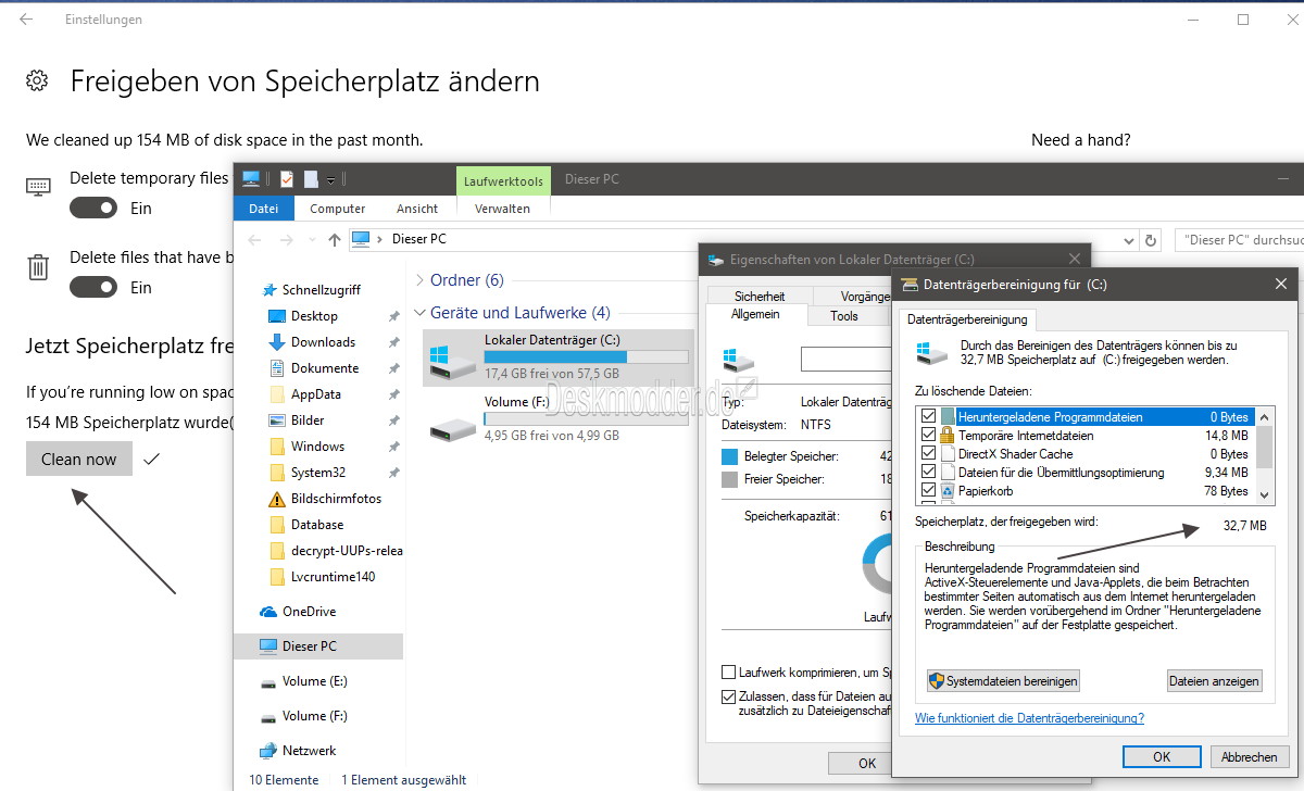 Neu ist auch die automatische Bereinigung der temporären Dateien und auch vom Papierkorb. Erreichbar über Einstellungen -> System -> Speicher. Dies wird / ist sicherlich mit der automatischen Wartung verbunden. Aber hier sollte man nicht zu viel erwarten. Nachdem ich es ausgeführt hatte, wurden zwar 154 MB gelöscht. Aber nachträglich habe ich die Datenträgerbereinigung gestartet (ohne Systemdateien zu bereinigen) und es waren trotzdem noch 32 MB die gelöscht werden konnten.