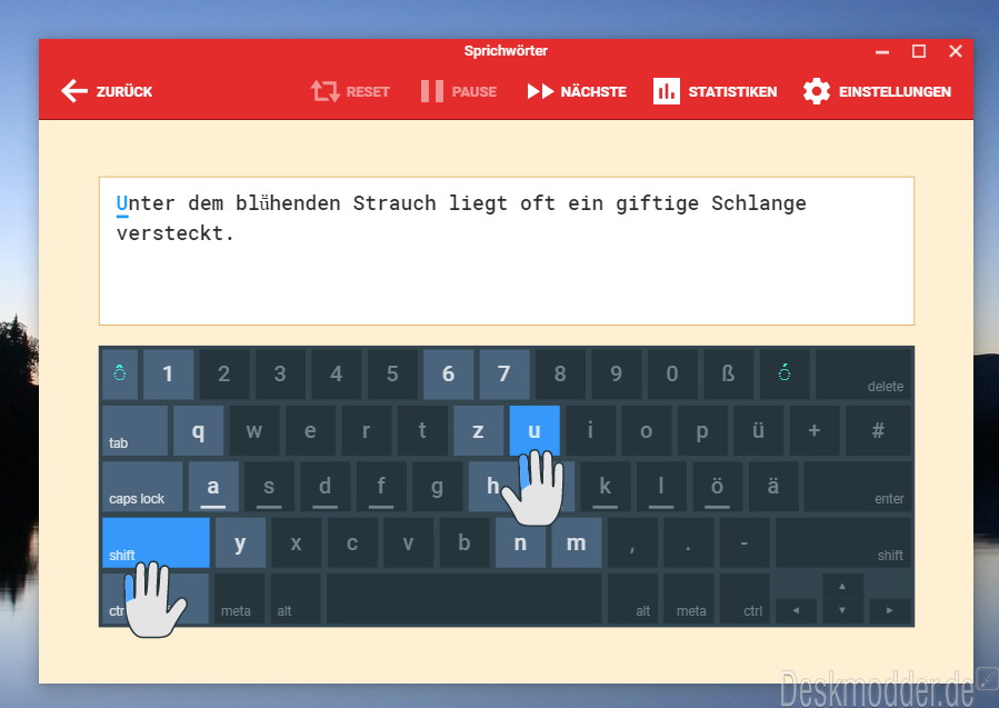 Die App bietet auch die QWERTZ-Tastatur an und über die Einstellungen lassen sich alle Textvorlagen auch auf deutsch umstellen. Man hat fünf Varianten zur Verfügung zum Lernen. Unter „Zufällig“ wird irgendwelcher Blödsinn an Text angeboten, den man nachtipopen muss. Unter Angebote werden Zitate von berühmten Leuten angezeigt, die man korrekt abschreiben muss.
