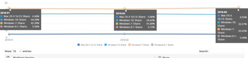 Denn vergleicht man so die letzten Monate, beispielsweise Dezember 2017, oder Januar 2018 mit dem März 2018, sieht man dass Windows 7 immer noch deutlich die Nase vorne hat und der Anteil der Windows 10 User kaum bis gar nicht steigt.