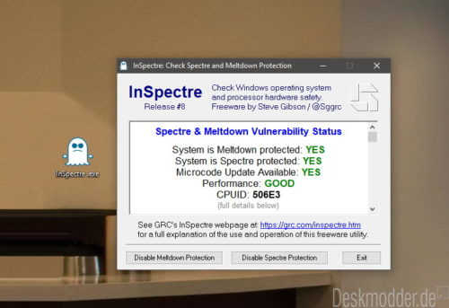 Erst gestern hatten wir darüber berichtet, dass Intel nun auch seine letzten Geräte der Intel NUC-Reihe ein Bios Update bereitgestellt hat. Siehe hier. Wer seinen Rechner noch einmal auf die Anfälligkeit auf Spectre oder Meltdown und die Leistungseinbuße testen möchte, findet InSpectre hier: grc.com/inspectre.