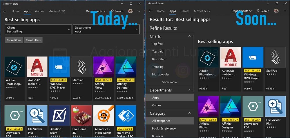 Wer in der Microsoft Store App einmal auf Apps und dann zum Beispiel auf „Beliebteste Apps“ geht, wird oben die Filterboxen zu sehen bekommen. Dies wird sich demnächst ändern. Denn mit der 11807.1001.4.0 bzw. 11807.1001.413.0 führen die Redmonder eine Änderung ein. Alle Filter die oben zu sehen sind werden in ein Menü gepackt, welches dann ausgeklappt werden kann.