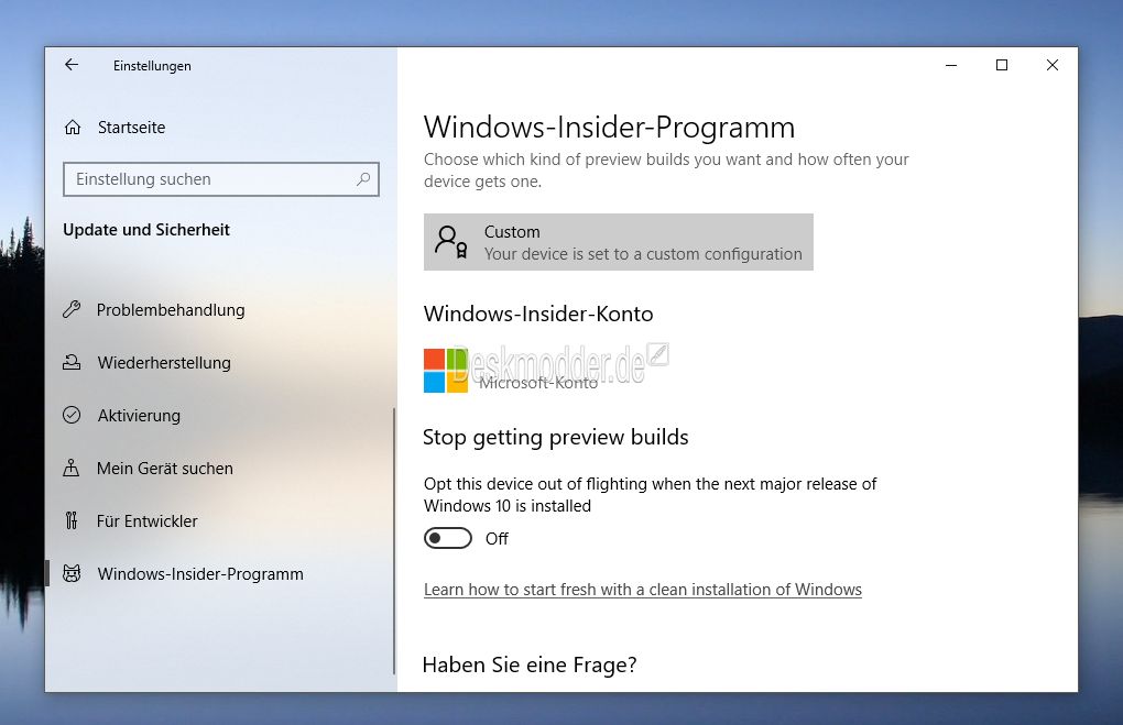 Bei Windows Update – Insider-Programm ist „Erste Schritte“ ausgegraut: Meine eMail-Adresse ist aber nach wie vor im Insiderprogramm registriert