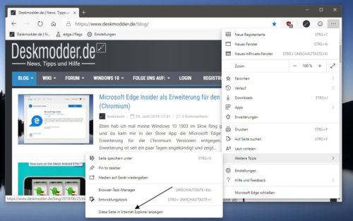 Und noch so nebenbei. Im aktuellen Canary lassen sich nun Webseiten im Internet Explorer öffnen. edge://flags Enable IE Integration aktivieren. Danach erscheint es unter Menü -> Weitere Tools -> Diese Seite im Internet Explorer anzeigen. (via)