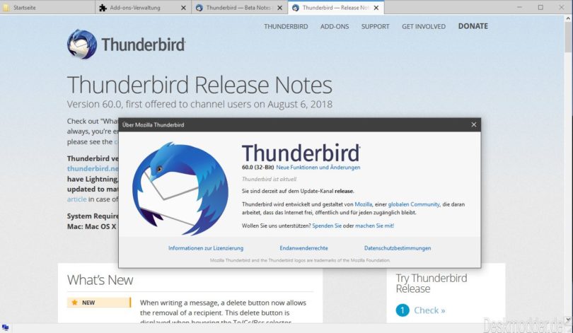 Bereits vor einigen Tagen hat Mozilla seinem Mail-Programm ein Update auf die Version 60.7.2 spendiert. Neue Funktionen sind nicht enthalten – dafür wurden aber mehrere Sicherheitslücken geschlossen. Offenbar wurde zumindest eine dieser als kritisch eingestuften Lücken auch bereits für Angriffe genutzt. Das Update sollte daher auf jeden Fall installiert werden (falls noch nicht automatisch geschehen).