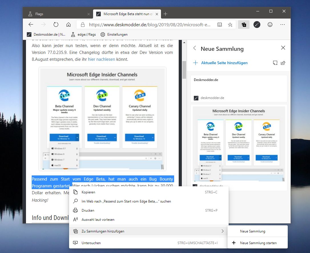 Im Microsoft Edge (Chromium) aktuell in der Canary Version wurde eine neue Funktion hinzugefügt, die sich Sammlungen (Collection) nennt. Einmal freigeschaltet, kann man Links, Bilder von Webseiten oder auch Textpassagen hinzufügen und speichern.
