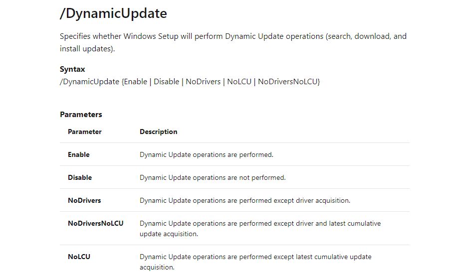 - setup /auto upgrade /dynamicupdate nodriversnolcu – Das dynamische Update wird mit Ausnahme des Treibers und des aktuellen kumulativen Updates durchgeführt.