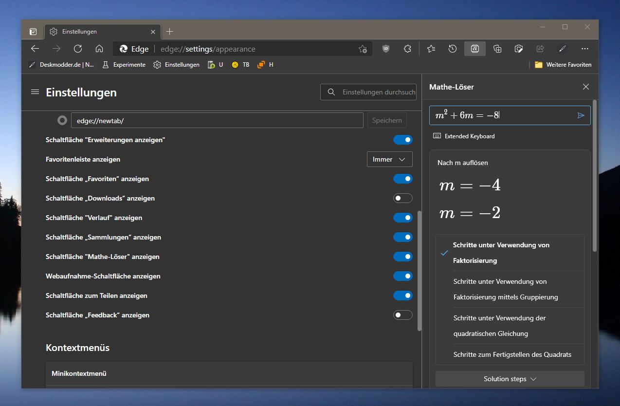 [Update 20.03.]: Im neuen Edge Canary 91.0.831.0 wurde nun eine Flag dafür integriert. Einfach edge://flag aufrufen und dort nach Math Solver in Edge suchen und auf Enabled stellen. Nach einem Neustart erscheint dann die Einstellung zur De- bzw. Aktivierung.