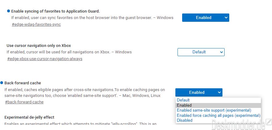 - Auch der „Back-forward cache“ kann in den Flags aktiviert werden. Damit kann der Cache auch bei Navigationen auf derselben Webseite aktiviert werden.