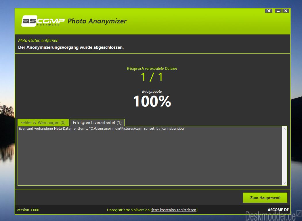 Ascomp hat ein neues kostenloses Programm Photo Anonymizer bereitgestellt, mit dem es möglich ist die Meta-Daten, GPS- oder auch ADS-Informationen (Alternativen Datenströme) aus einem oder mehreren Bildern zu entfernen.