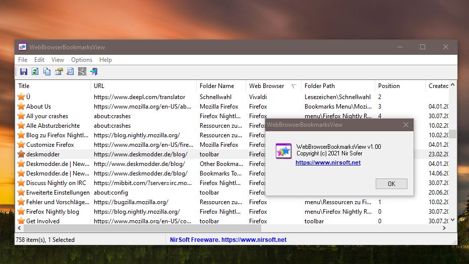 Wer mehrere Browser sein Eigen nennt, wird auch in jedem die jeweiligen Favoriten / Bookmarks angelegt haben. Wer mal neugierig ist, welche sich da mit der Zeit so angehäuft haben, kann das neue portable Tool WebBrowserBookmarksView nutzen.