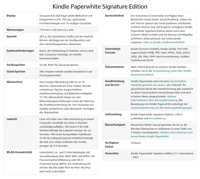 Der erste Kindle Paperwhite Signature Edition verfügt zusätzlich über einen Lichtsensor zur automatischen Anpassung der Beleuchtung, 32 GB Speicherplatz und erlaubt erstmals drahtloses Laden. Der neue Kindle Paperwhite kostet 129,99 Euro und ist mit 8 GB Speicherkapazität in Schwarz erhältlich. Der neue Kindle Paperwhite Signature Edition wird ebenfalls in Schwarz angeboten, verfügt über 32 GB Speicher und ist für 189,99 Euro erhältlich. Beide Geräte können ab sofort vorbestellt werden. Der neue Kindle Paperwhite wird ab dem 27. Oktober, der Kindle Paperwhite Signature Edition ab dem 10. November ausgeliefert.