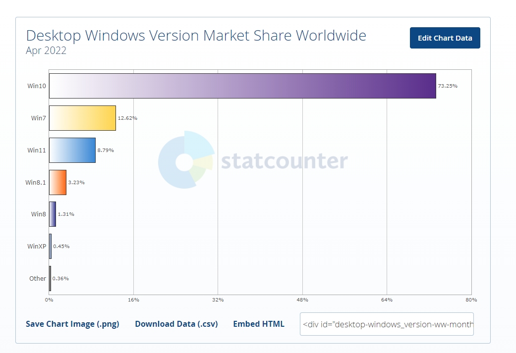 Statistiken sind immer so eine Sache. Es kommt immer darauf an, welche Zahlen erhoben und ausgewertet werden. Von StatCounter gibt es eine neue Statistik für April 2022. Gegenüber AdDuplex hier mit allen Windows-Versionen.