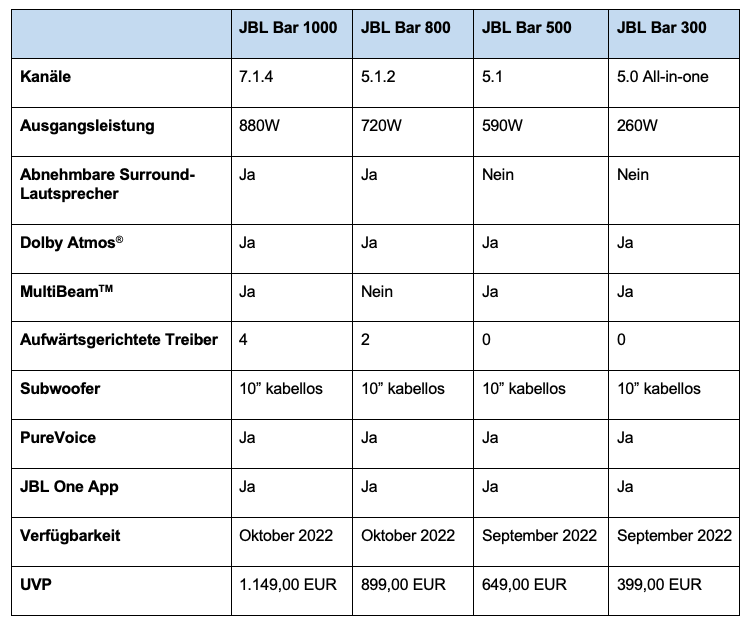 Nachdem wir eben bereits über die neue Soundbar aus dem Hause Sony berichtet hatten, möchten wir euch auch über die vier neuen Soundbars von JBL informieren. JBL präsentiert mit der Bar 1000 eine Soundbar, die mit Dolby Atmos und DTS:X 3D-Surround-Sound über ihre vier nach oben ausgerichteten Treibern für fesselndes Heimkino sorgt. Das Topmodell der brandneuen JBL Bar-Serie wird ergänzt durch die JBL Bar 300, JBL Bar 500 und JBL Bar 800.