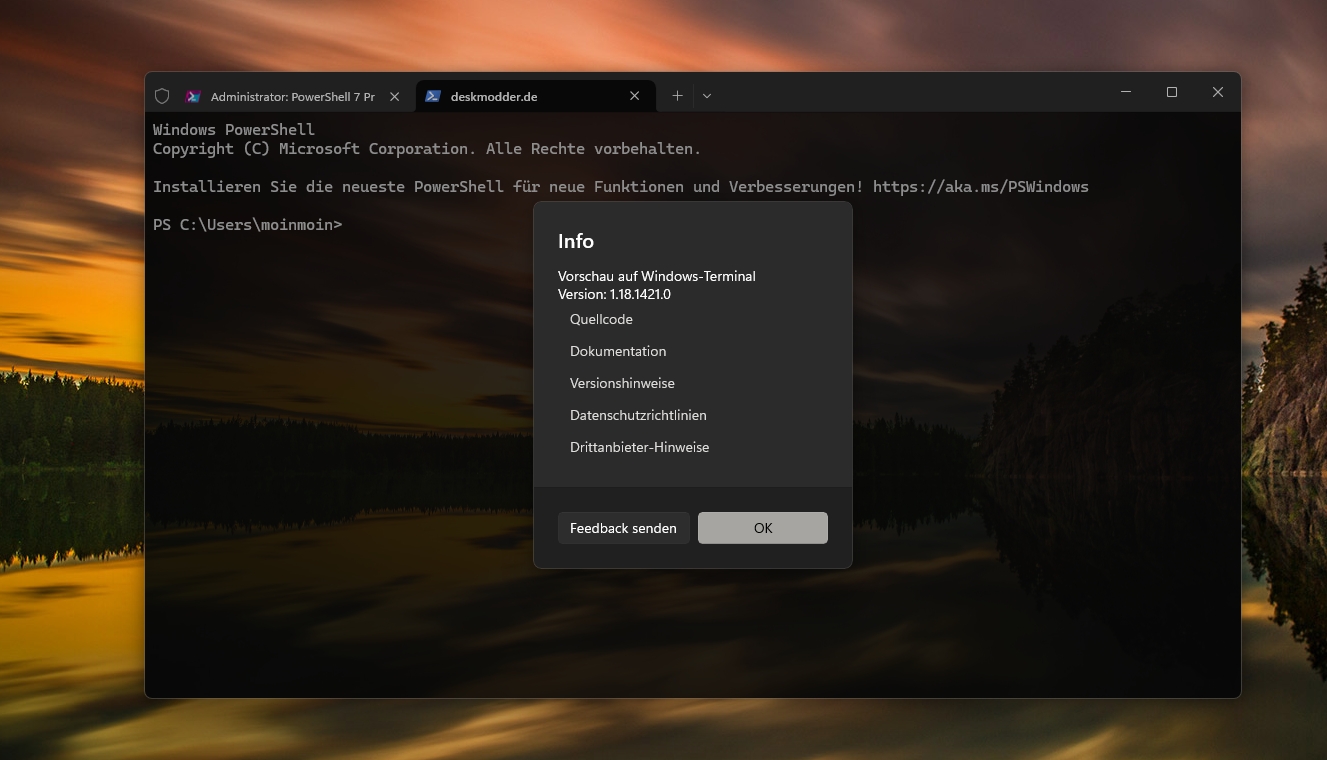 Lange ist es her, dass Microsoft das Windows Terminal aktualisiert hat. Jetzt wird die Preview auf die 1.18 (1.18.1421.0) und die Stable auf die 1.17 (1.17.11391.0) aktualisiert. Wie schon hier berichtet, lassen sich die Tabs im Terminal 1.18 nun herausziehen, oder in ein anderes Fenster integrieren.