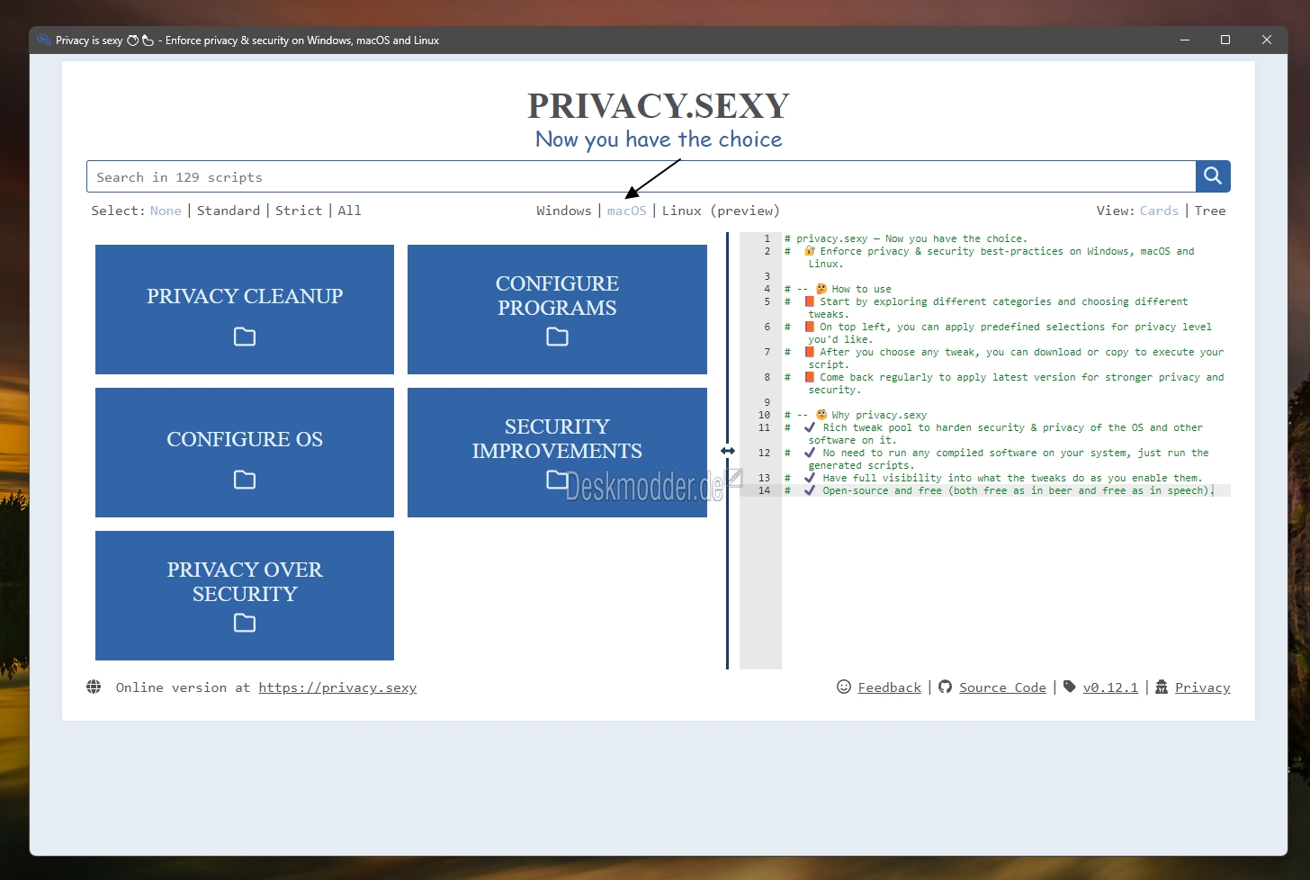 privacy.sexy (abgeleitet von privacy is sexy) ist eine Sammlung an Einstellungen für Windows, macOS und auch Linux. Diese kann Online zusammengestellt und als Script (*.bat) heruntergeladen werden. Oder man nutzt die Offline-Version, die auf GitHub bereitsteht. Der Vorteil hier ist, dass die Befehle gleich ausgeführt werden können.