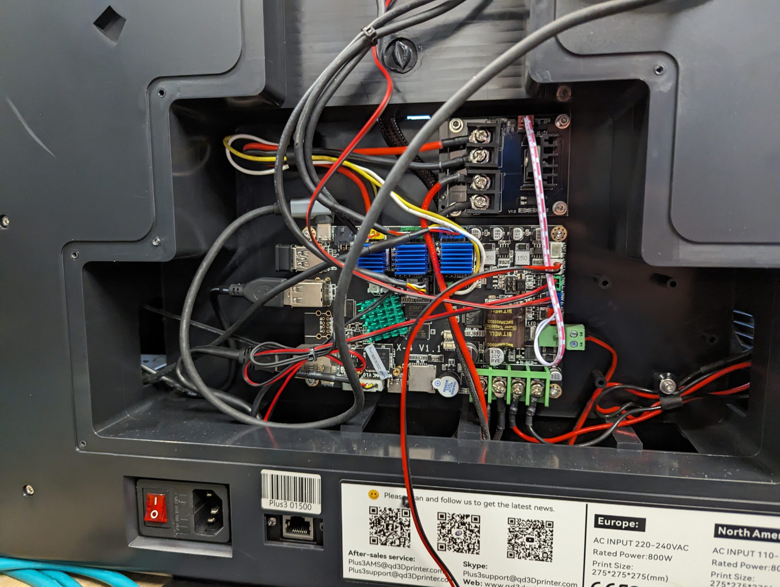 Mit 800 Watt liegt der Qidi X-Plus 3 sehr deutlich über dem Prusa MK3s und Prusa Mini aber unter dem Bambulab P1P. Die Kabelführung im Inneren ist okay bis gut. Am Mainboard bzw. an der Hauptsteuerungseinheit wären sogar noch USB-Anschlüsse für beispielsweise eine Kamera verfügbar. Was nicht so schön ist: Oft schraubt man in Plastik. Das sollte man also nicht allzu oft machen.