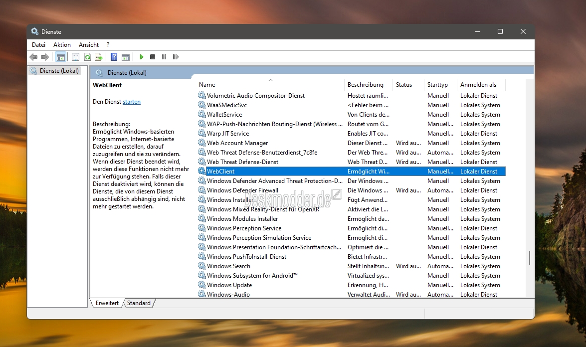 - Webclient (WebDAV)-Dienst – Der Webclient-Dienst wird unter Windows standardmäßig nicht gestartet. „Ermöglicht Windows-basierten Programmen, Internet-basierte Dateien zu erstellen, darauf zuzugreifen und sie zu verändern.“