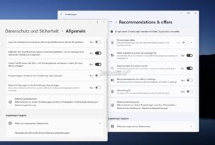 Bislang sind die Einstellungen unter Datenschutz und Sicherheit -> Allgemein zu finden. Im Test wird dafür jetzt ein eigener Bereich „Empfehlungen und Vorschläge“ hinzugefügt. Ich weiß, viele würden dazu Werbeeinstellungen sagen, aber es ist ja nicht nur grundlegend Werbung. Man kann nur hoffen, dass Microsoft hier so clever ist und alle diese Einstellungen nach und nach zusammenfasst, um es dem Nutzer einfacher zu machen, diese zu konfigurieren.