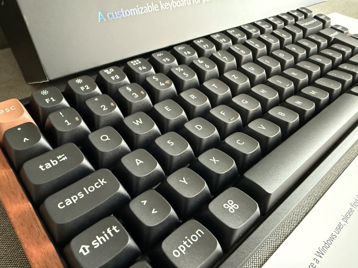 Keychron-Tastaturen besitzen seit jeher die Tradition, ein Mac-Layout zu bevorzugen. Wer eher auf Windows setzt, kann einerseits die jeweiligen Tastenkappen wie die Command- und Option-Taste gegen die Windows-Pendants austauschen, andererseits an der linken Seite einen Schalter verschieben, der dann das Windows-Verhalten aktiviert. Und wer komplett andere Tastenkappen haben möchte, kann Cherry-MX-kompatible Tastenkappen besorgen und diese bequem austauschen. Das passende Werkzeug ist schließlich mit dabei.