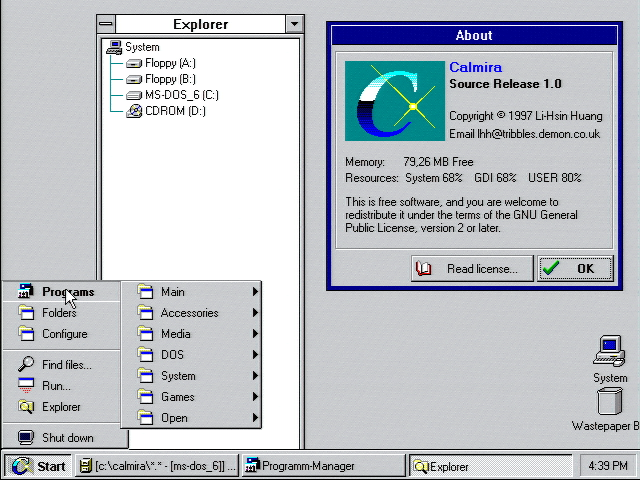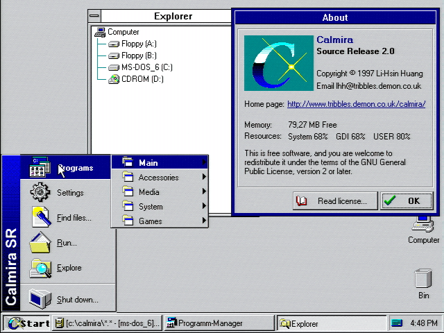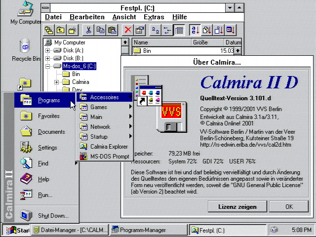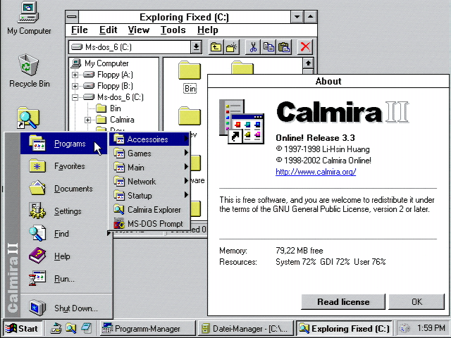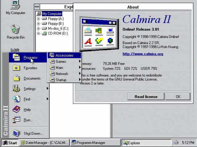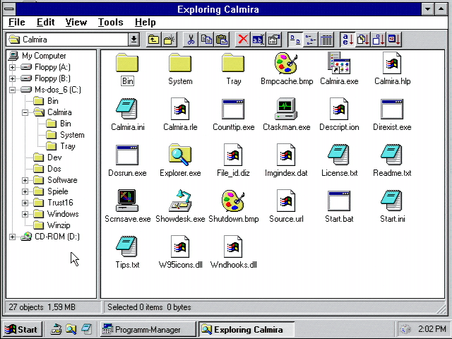 Wer sein Windows-3.1-System mit Komfortfunktionen ausstatten möchte oder es einen Hauch von Windows 95 verpassen möchte, kommt an Calmira nicht vorbei. Das Startmenü funktioniert gerade auf alten Systemen vernünftig (wenn auch nicht 100-prozentig frei von Macken) und der bequemere Dateimanager namens „Explorer“ macht die Dateiverwaltung wesentlich angenehmer. Zumal sich Calmira an die eigenen Bedürfnisse anpassen lässt. Findige Tüftler ziehen sich die Quelldateien und werkeln fleißig an den Innereien der Shell in Delphi rum. Der Vorteil, wenn die Software seit seiner Existenz Open Source ist.