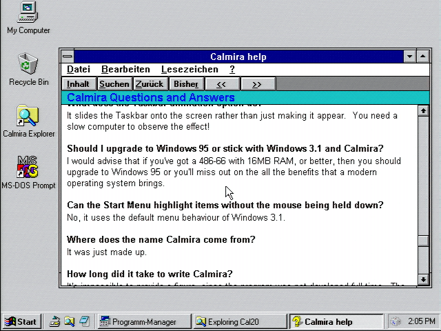 Ironischerweise riet der Schöpfer von Calmira in der Hilfedatei selbst dazu, bei einem entsprechend dimensionierten System doch eher auf das Original zu setzen. Sprich, wenn der Rechner mindestens einen 486er mit 66 Megahertz und 16 Megabyte Arbeitsspeicher hat, sollte man auf Windows 95 setzen. Wenn man sich im Internet umschaut, kam kaum ein Calmira-Nutzer diesem Aufruf nach.