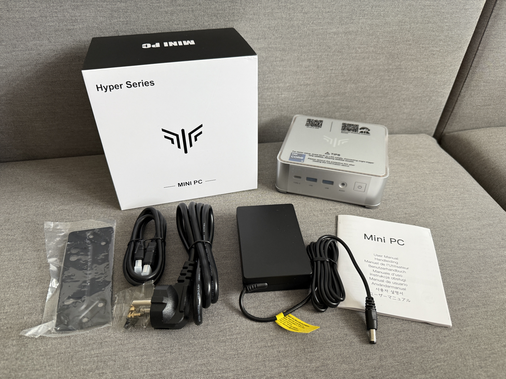Der Hyper H2 kommt in einer kompakten Schachtel daher, die das Featureset und das Logo zeigen, welches mir schon mal an einem Acemagic-Laptop begegnet ist. Neben dem Mini-PC an sich kommt die Box mit folgendem Inhalt