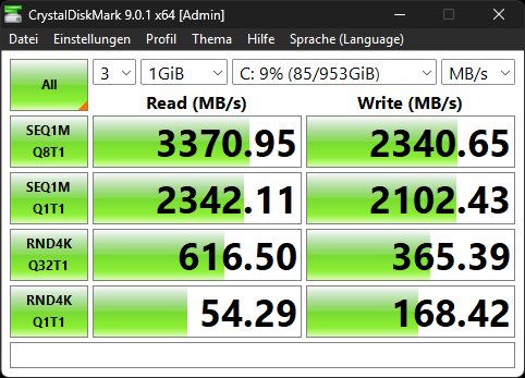 CrystalDiskMark spuckt solide Werte für die mitgelieferte SSD aus. Es sind definitiv keine Topwerte, aber für einen günstigen Rechner gute Zahlen und im Alltagsbetrieb wird man ohnehin keinen großen Unterschied zu M.2-SSDs bekannterer Marken merken. Zumal der Systemstart wahnsinnig flott abläuft.