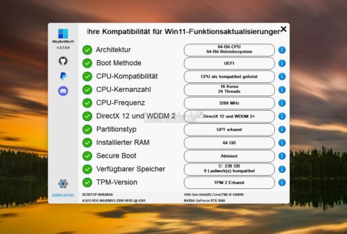Wenn es darum geht, ob ein alter Rechner auch für Windows 11 und den Vorgaben geeignet ist, ist das kleine portable Tool WhyNotWin11 die Nummer 1. WhyNotWin11 prüft die einzelnen Punkte der Kompatibilität und zeigt dann an, welche Probleme noch enthalten sind.