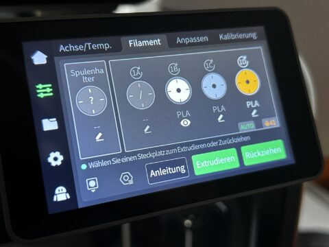 Besonders interessant ist die Multicolor-Funktion, die zu den Alleinstellungsmerkmalen zählt. Mit einer CFS-Einheit stehen vier Farben bereit, mit bis zu vier Einheiten steigt die Zahl sogar auf 16. Dabei werden die Spulen automatisch erkannt und synchronisiert, ein integrierter Cutter sorgt für saubere Farbwechsel, und durch das Filament-Relay werden Unterbrechungen beim Wechsel vermieden. Das spart Zeit und verhindert Fehldrucke.