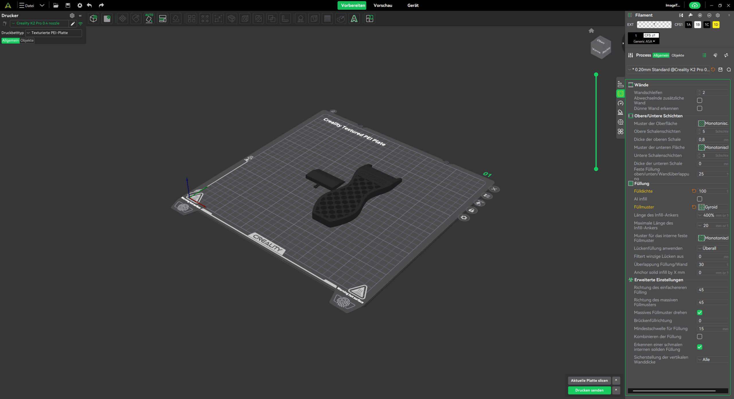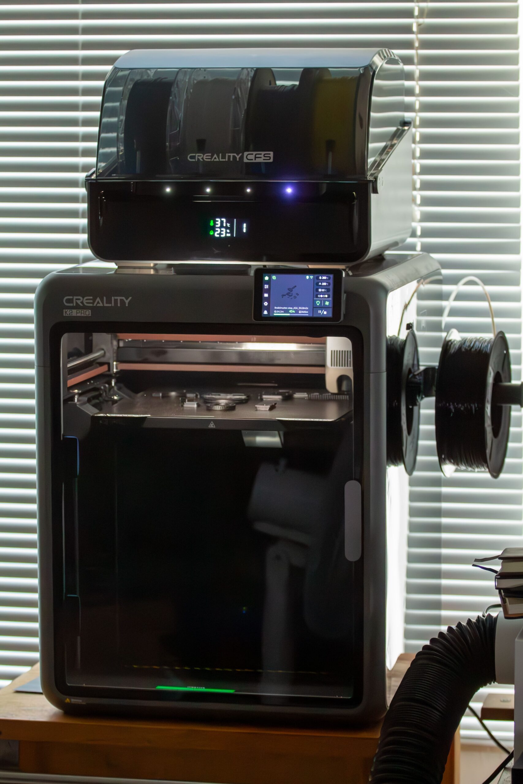Im Alltagstest zeigte der K2 Pro, dass er auch bei großvolumigen Drucken nicht ausgebremst wird. Selbst bei sehr hohen Geschwindigkeiten bleibt die Druckqualität stabil, was vor allem an der präzisen Mechanik und den kräftigen Step-Servo-Motoren liegt. Unterstützt wird das Ganze durch die aktiv beheizte Baukammer, die den Innenraum auf bis zu 60 Grad bringt. Gerade bei Filamenten wie ABS oder ASA, die sonst gerne zu Rissen oder verzogenem Druckbild neigen, macht sich dieses Feature deutlich bemerkbar. Gerade bei kohlefaserverstärkten Filamenten macht sich dieser Vorteil bemerkbar.