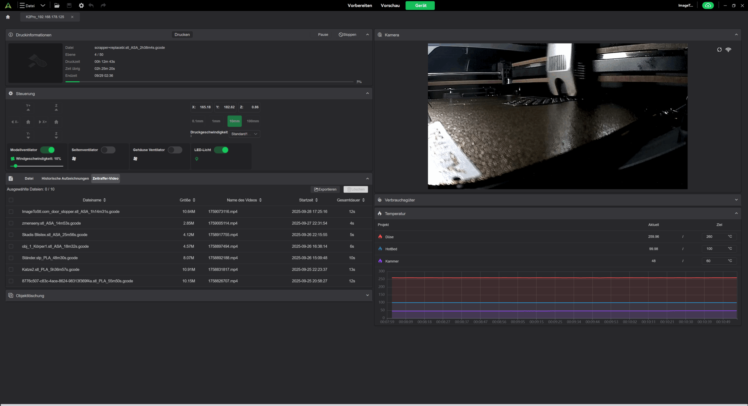 Auf Softwareseite setzt Creality beim K2 Pro auf Creality OS, das auf Klipper (Fluidd) basiert. Standardmäßig erfolgt die Steuerung über die Creality-Oberfläche, die mit klaren Menüs und übersichtlicher Darstellung überzeugt. Hier lassen sich Drucke starten, Temperaturen einstellen und die Kamerabilder im Blick behalten.