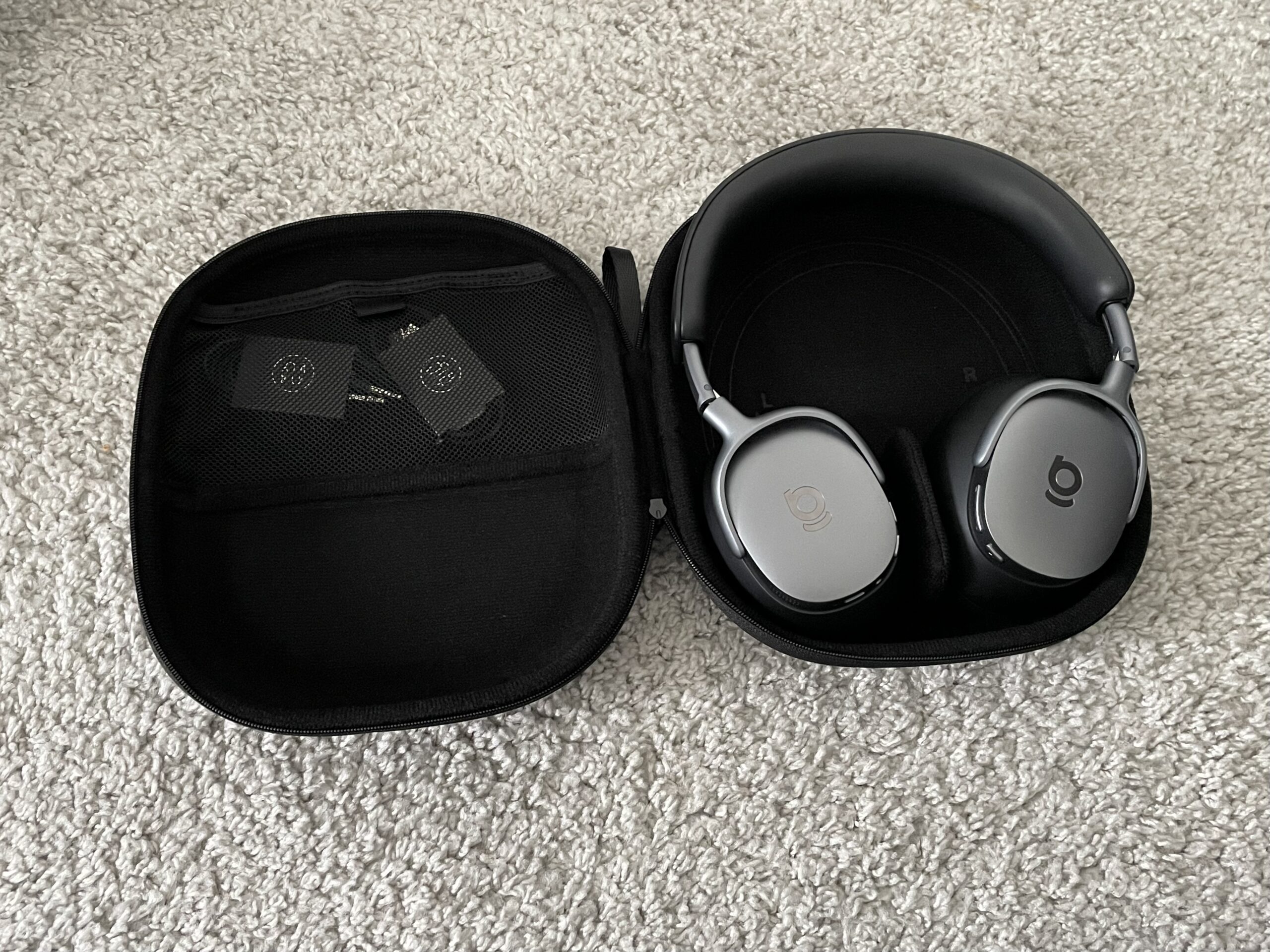 • Im Lieferumfang ist ein Case enthalten, welches einen robusten Eindruck macht. Allerdings passt der Kopfhörer im bei mir relativ weit ausgezogenen Zustand nicht mehr in das Case. Man müsste die Enden also dafür etwas zusammenschieben.
