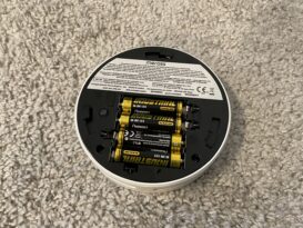 Der Meross-Rauchmelder mit EN14604-zertifizierung kommt mit seinem weißen Gehäuse optisch relativ schlicht daher und wird mit bis zu 4 AA-Batterien (im Lieferumfang enthalten) betrieben. Die Batterielaufzeit wird mit 3 Jahren angegeben.