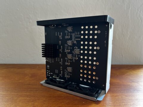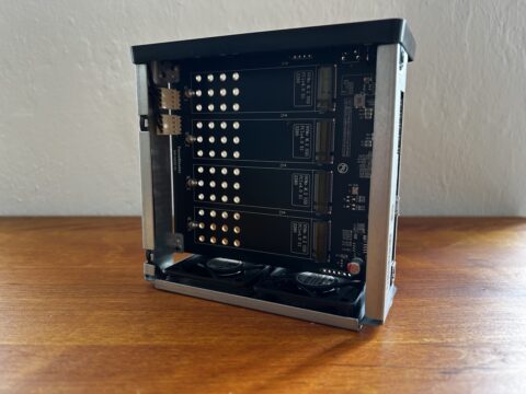 Nach dem Lösen von einer Schrauben lässt sich der Deckel abziehen und der Blick auf das Innenleben freigeben: vier M.2-Slots für NVMe-SSDs im 2280-Format, sauber beschriftet und leicht zugänglich. Der Einbau ist in wenigen Minuten erledigt, Werkzeug liegt bei. Kühlpads sind ab Werk nicht vorhanden, lassen sich aber problemlos nachrüsten.