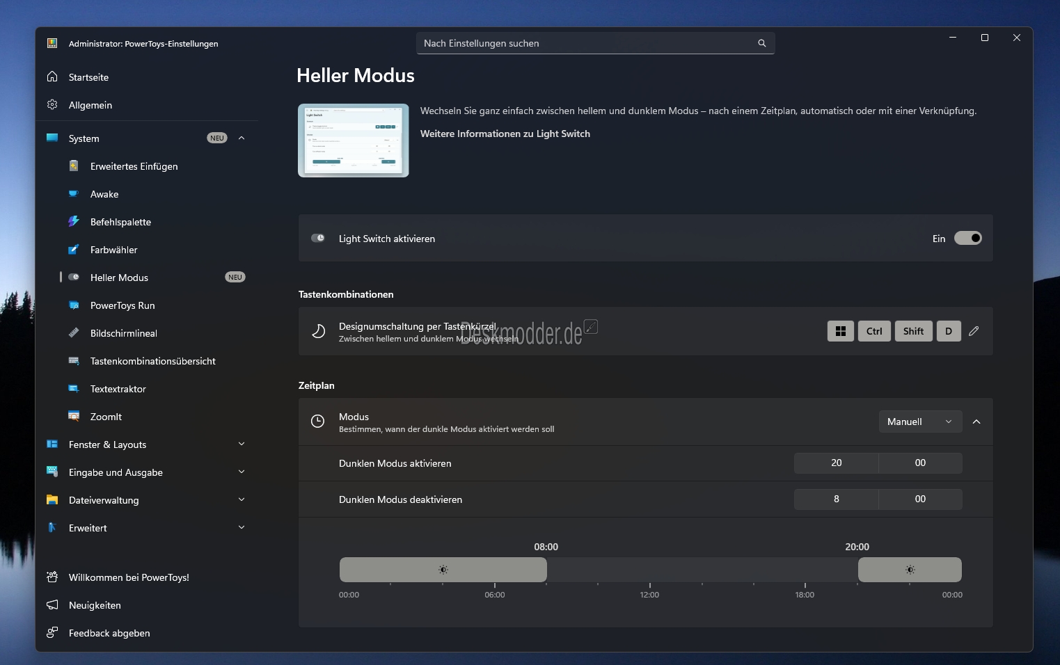 Heute früh hat Microsoft die PowerToys 0.95.0 freigegeben. Das Update wird auch schon direkt in der App angeboten und kann installiert werden. Neu dabei ist „Light Switch“ (Heller Modus). Mit diesem Modul ist es möglich, zwischen hell und dunkel umzuschalten und auch die Uhrzeit dafür einzustellen.