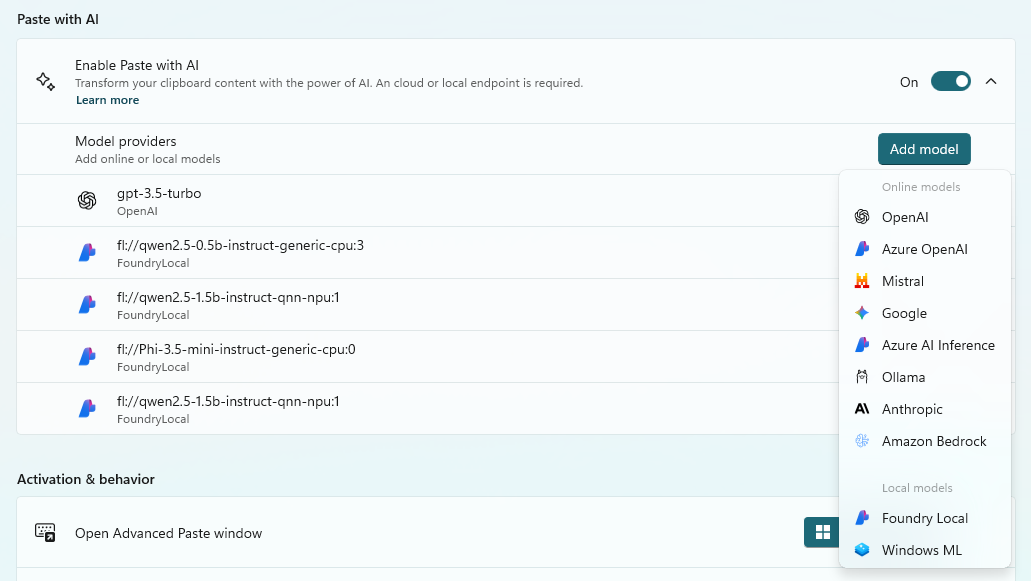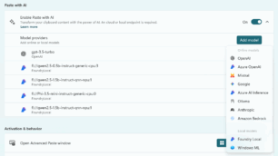 Das Team hat heute mal einen Ausblick darauf gegeben, was uns erwartet. Und zwar lässt sich dann der Inhalt in der Zwischenablage mit einem online- oder lokalen Modell transformieren. Das derzeit verwendete Modell in PowerToys -> Erweitertes Einfügen ist eine fest codierter String. Das soll sich dann ändern. In den beiden Bildern seht ihr die Auswahl. Diese kann sich noch ändern. Ebenso der Zeitplan, der für November und die Version 0.96 gesetzt ist.