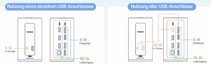 Die Stromversorgung der einzelnen Anschlüsse bei Betrieb des Docks mit einem 100W-Netzteil gibt der Hersteller wie folgt an: