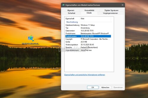 (Update 30.10.2025): Microsoft hat das MediaCreationTool (MCT) aktualisiert. In den Eigenschaften erkennt ihr die Version 10,0.26100.7019. Damit kann das MCT jetzt auch wieder unter Windows 10 genutzt werden.