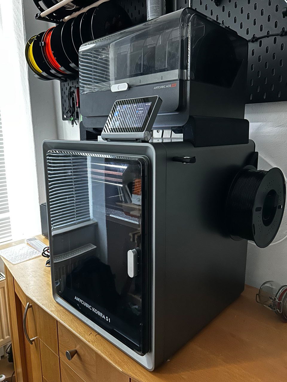 Beim Testgerät zeigte sich gleich zu Beginn ein Problem: Die Verbindungsplatine des ACE Pro war ab Werk defekt und wurde vom Drucker fälschlicherweise als ACE 2 erkannt – obwohl nur ein ACE Pro angeschlossen war. Damit war die automatische Materialverwaltung zunächst nicht nutzbar. Nach Recherchen in einschlägigen 3D-Druck-Communities zeigte sich, dass dieser ACE-2-Fehler kein Einzelfall ist. Mehrere Nutzer berichten von ähnlichen Problemen direkt nach der Inbetriebnahme oder nach Firmware-Updates. Der Anycubic-Support reagierte jedoch schnell und zuverlässig: Bereits wenige Tage später traf eine Ersatzplatine ein. Nach dem Austausch funktionierte die Kommunikation fehlerfrei, und das Filamentsystem arbeitete stabil.