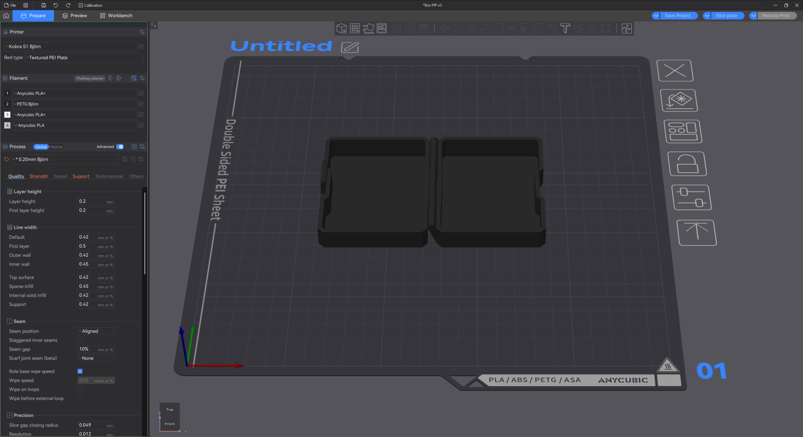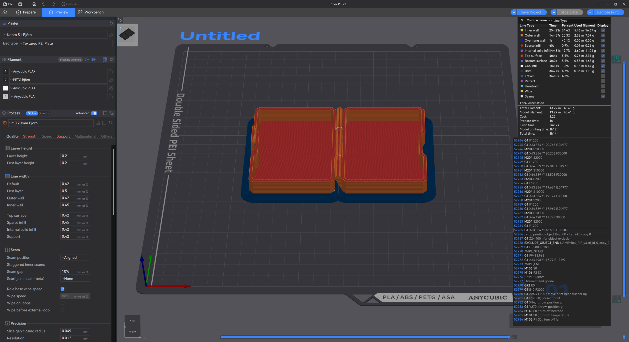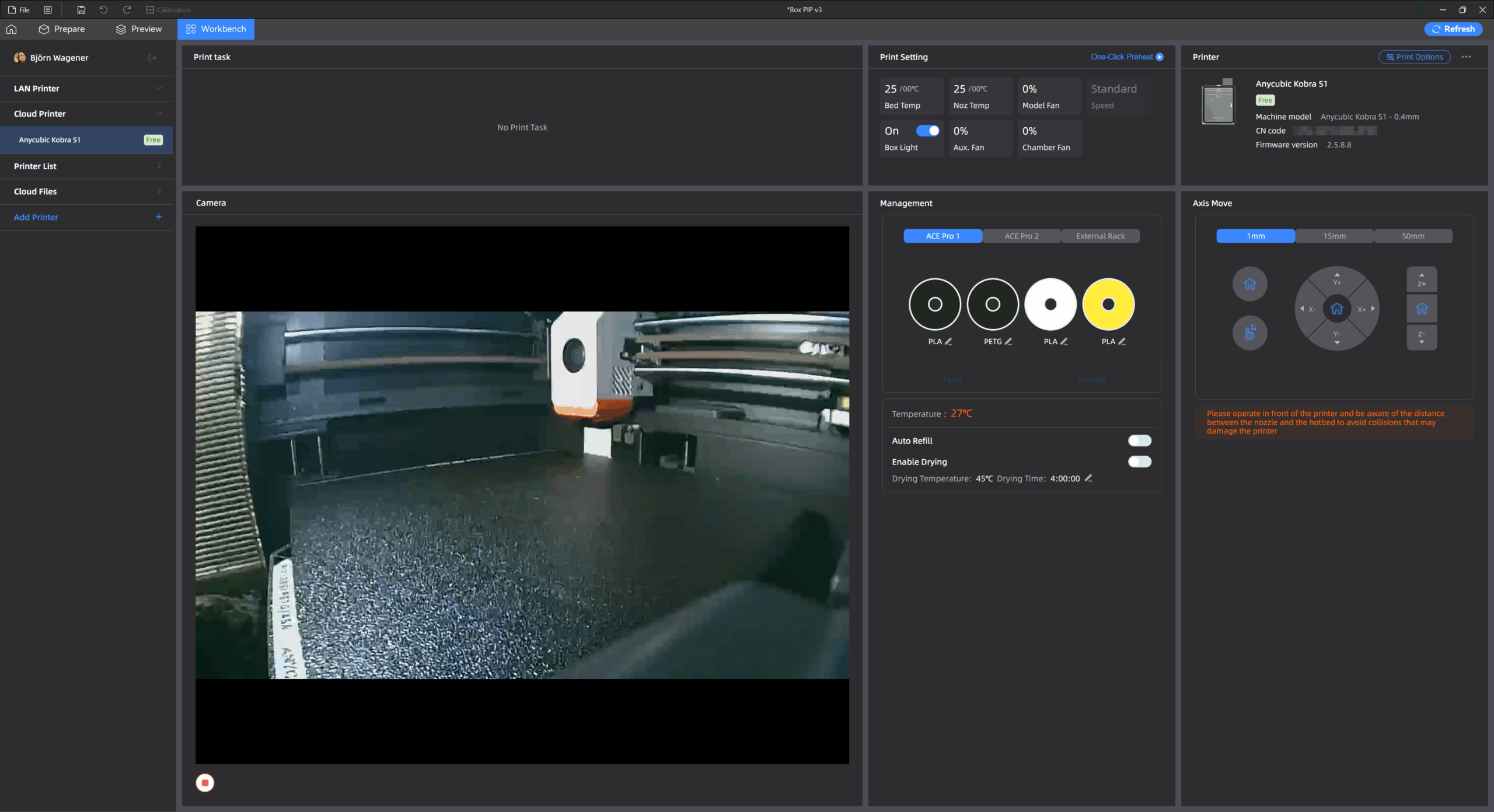 Als Software kommt der neue Anycubic Slicer Next zum Einsatz. Die Benutzeroberfläche wurde überarbeitet, bietet eine schnellere Druckvorschau und eine deutlich verbesserte Materialverwaltung. Das Zusammenspiel zwischen Drucker und Slicer funktionierte reibungslos: Filamentwechsel wurden korrekt erkannt, und die aktive Trocknung des ACE Pro ließ sich direkt über das Interface steuern.