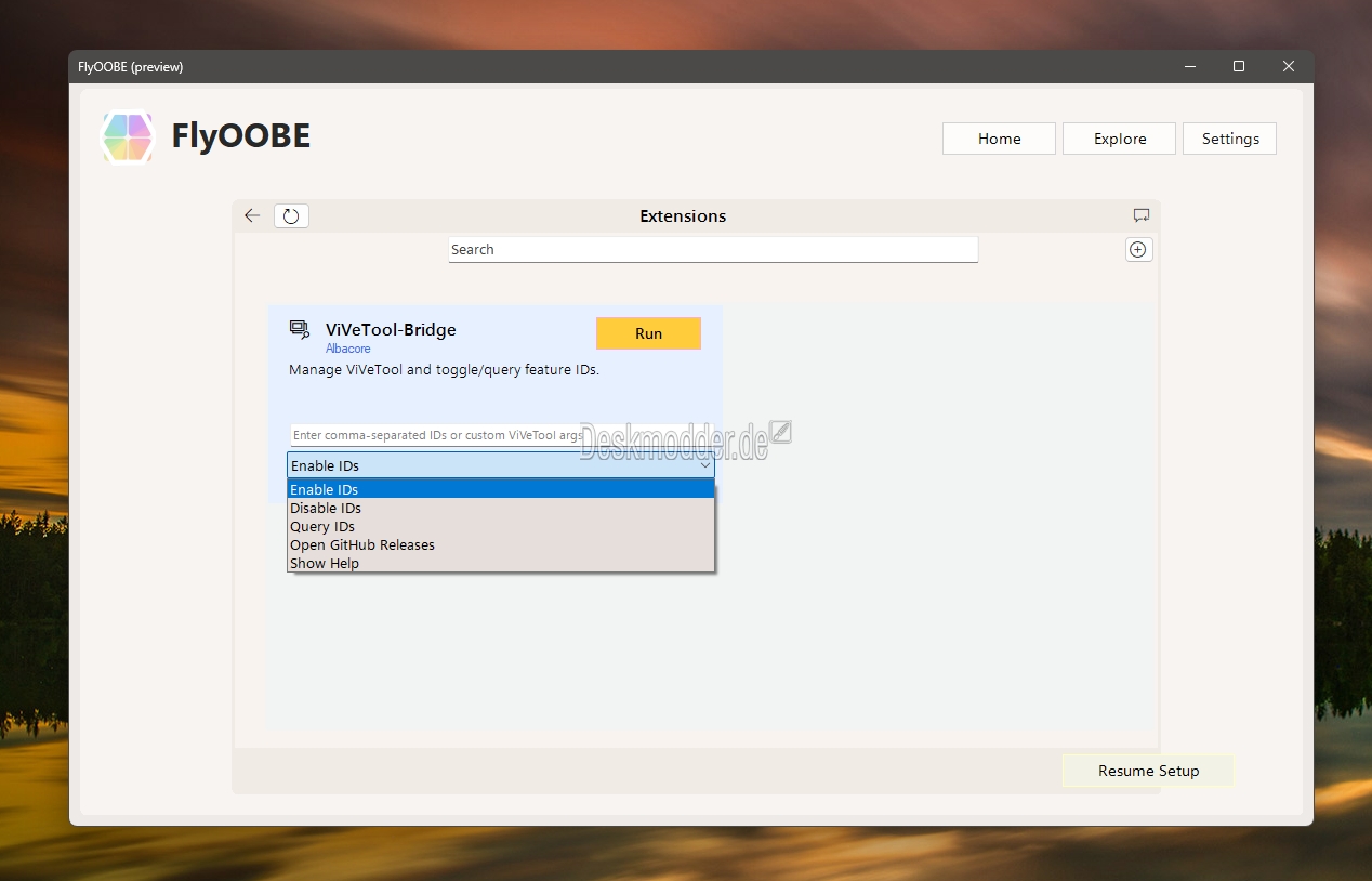 Die bisherigen Funktionen sind so weit geblieben. Das Funktionsupdate für die 25H2 starten. IDs für das ViVeTool eingeben und aktivieren, bzw. wieder deaktivieren/zurücksetzen. Oder der eigentliche Sinn des Tool, die OOBE-Einstellungen vornehmen und auch mithilfe von externen Skripten Windows aufzuräumen.